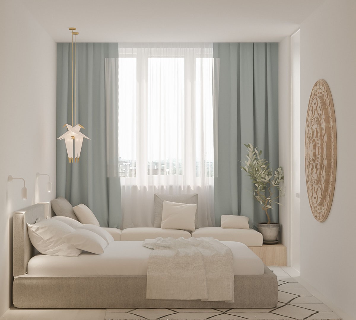 The bedroom takes simplicity even further, but modern wall sconces provide light and a bird lamp adds a touch of whimsy.