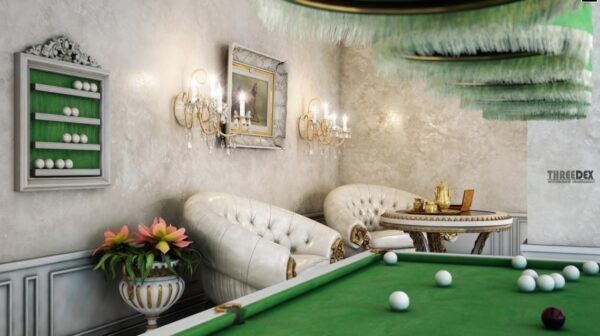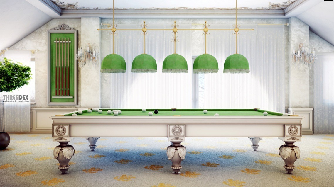 More visualization awesomeness! With gold gilding, green accents and opulent finishings TheeDex studio brings to life this classic abode of a Victorian gentleman. The details in the images just keep hitting you.... from the glimmer of the lighting to the shadows of the pool balls to the puckers of the diamond tufting on the leather chairs. Only nitpick we have is that some of the images look a little washed out. Perhaps rather than going for true photorealism the designers were gunning for surreal grandeur. Let us know what you think of this home...