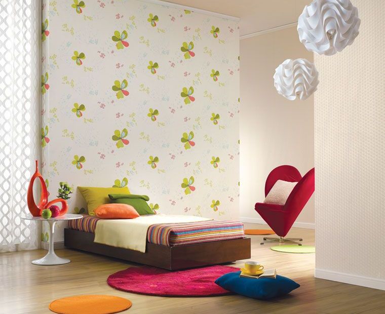 Most little girls just love whimsical floral fields of daisies and tulips, and don't be afraid to team an eye-catching design like this with another patterned wallpaper too; the trick is to go for a corresponding hue, in a very small print such as a polka dot, thin pinstripe. or a mini floral motif with plenty of breathing space in the arrangement.