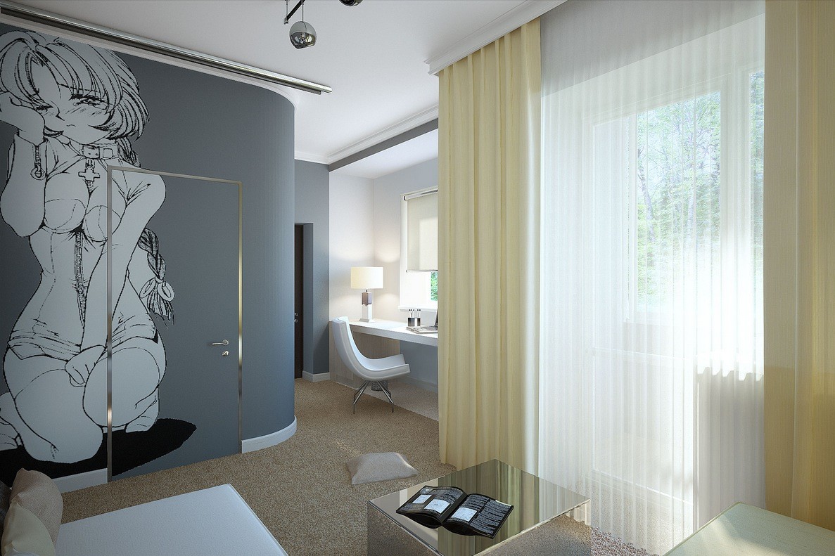 We begin with a youthful look, smoothed out in cool gray painted walls complete with huge Manga style murals.