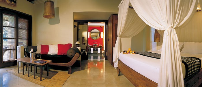 The bedroom in one of the deluxe villas boasts a wall open to the outdoor and furnished in traditional Indonesian decor.