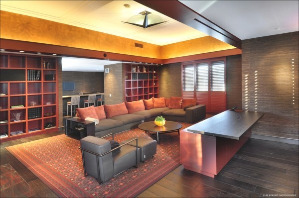 The formal dining room sees the vast ceiling height drop, evoking a more intimate ambience for over dinner conversation. The dining chairs set around this unusual table design look suspiciously like basketball nets...