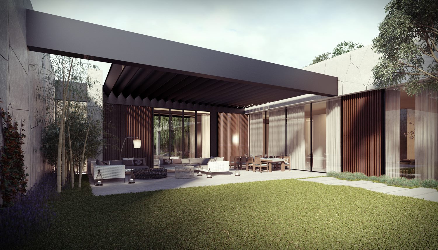 The roof of the building extends over some of the exterior living areas to blur the boundaries between house and garden further.