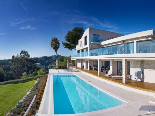 Swish interiors with an expensive feel welcome the owner to their high-class holiday home that has a multi-level design, layered into the coastal rock formation.