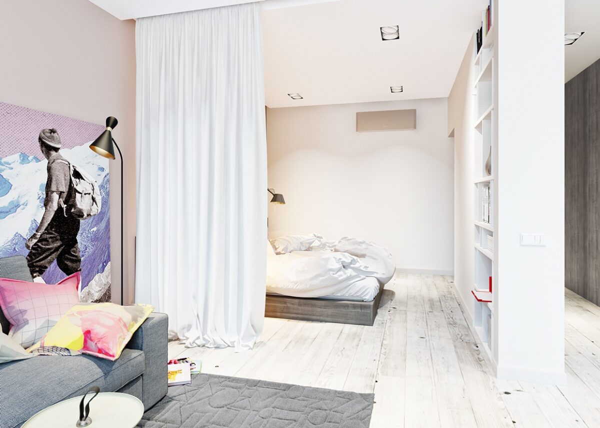 When it comes to our concept of what constitutes a home - its living room, its bedrooms, its dining areas - it really depends on how we grow up. The suburban child may grow up with her own bedroom, canopy bed, and private en suite bath while a child in the city is used to sharing a bedroom with her sister and a bathroom with her parents. But still, most of us find the maximum comfort level with walls that separate the distinct areas of the home, particularly the bedroom. The designs featured here take the comfortable idea of a separate bedroom and challenge it. They are studio apartments with living and sleeping areas closely intertwined, if not completely overlapping. The designers have managed to make this concept comfortable through the use of meticulously chosen furniture, cozy design elements, and careful consideration as to how the residents of these homes will move through and exist in them comfortably, without the need for more walls.