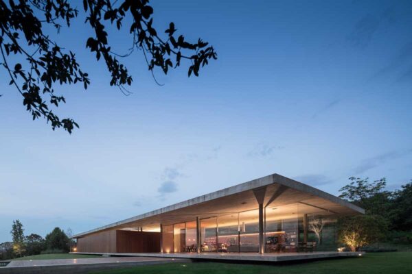 Perhaps the most noticeable visual cues in this home are the dual slabs - the floor and the ceiling - that sandwich the large window panes. These concrete pieces create and almost overwhelming sense of long and clean, situating the house perfectly in modern style. The way in which the floor was created, sitting 50 centimeters (about 20 inches) off the ground, the home almost seems to float above the earth.