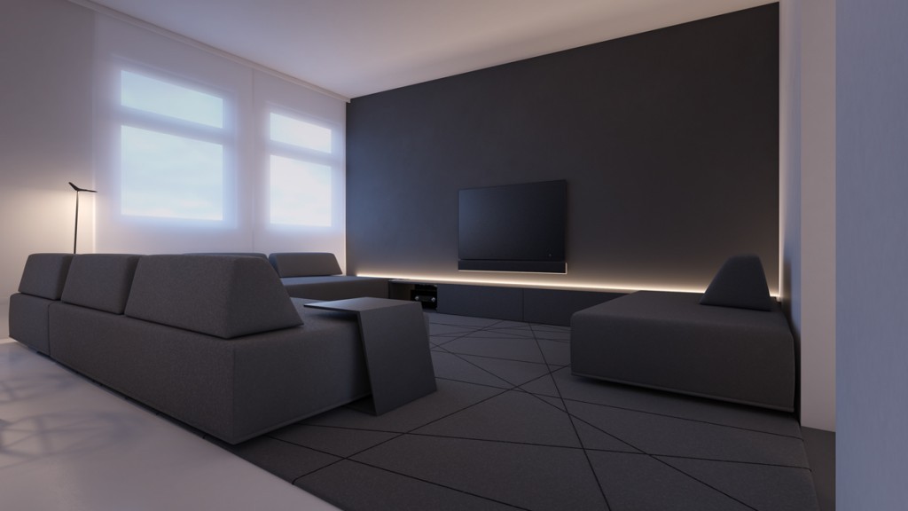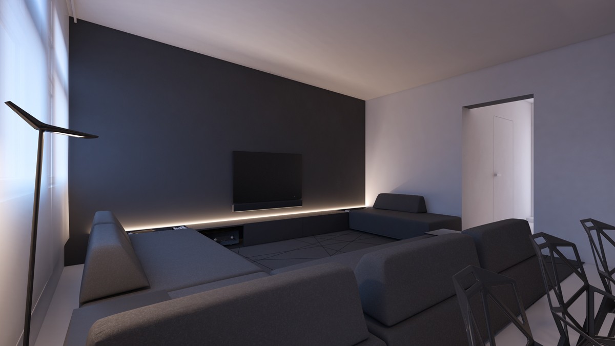 The first house is located in Wroclaw and draws heavily a dark gray color palette. The main living area features a dark gray modular sofa with cushions that can easily be swapped and slid and removed according to an individual's comfort level.