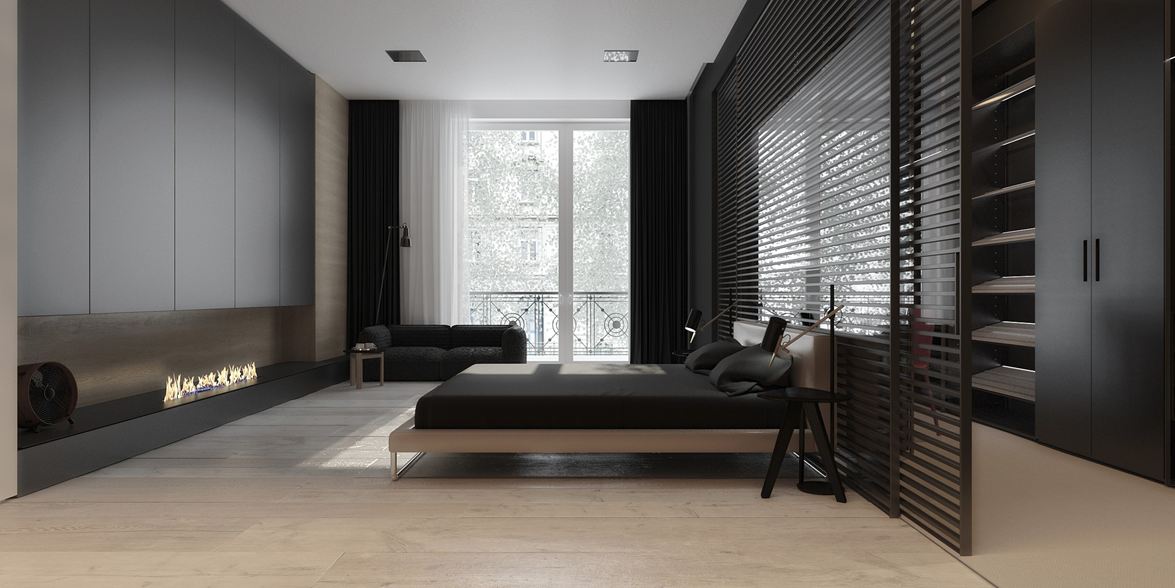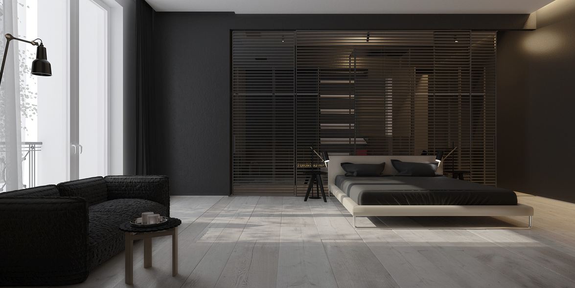 On the other hand, this highly masculine space uses darker colors to emphasize those same lines. A low bed and deep, dark gray put a point on the minimalist style, with no superfluous design elements whatsoever.