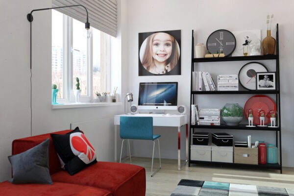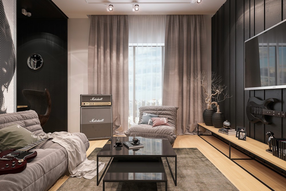 The second space is just the living room of an apartment what was designed for a young couple. It is not difficult to guess that John Lennon is a major inspiration for the occupants of this particular flat. The living room is divided into a small work area and a larger guest area. Custom shelving, comfortable seating and a large graphic portrait of John Lennon mean the space is certainly inspirational, but also welcoming for friends and family.