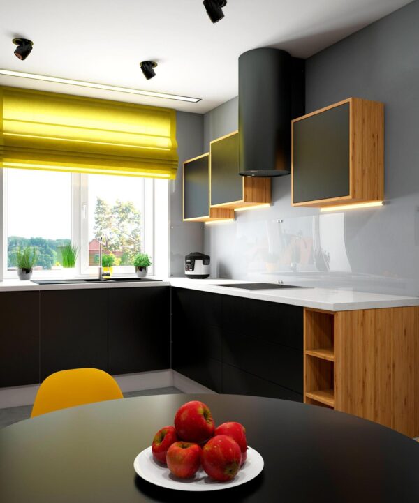 Glossy white cabinets, a glass range hood, and wooden backsplash perfectly follow the apartment's material theme.