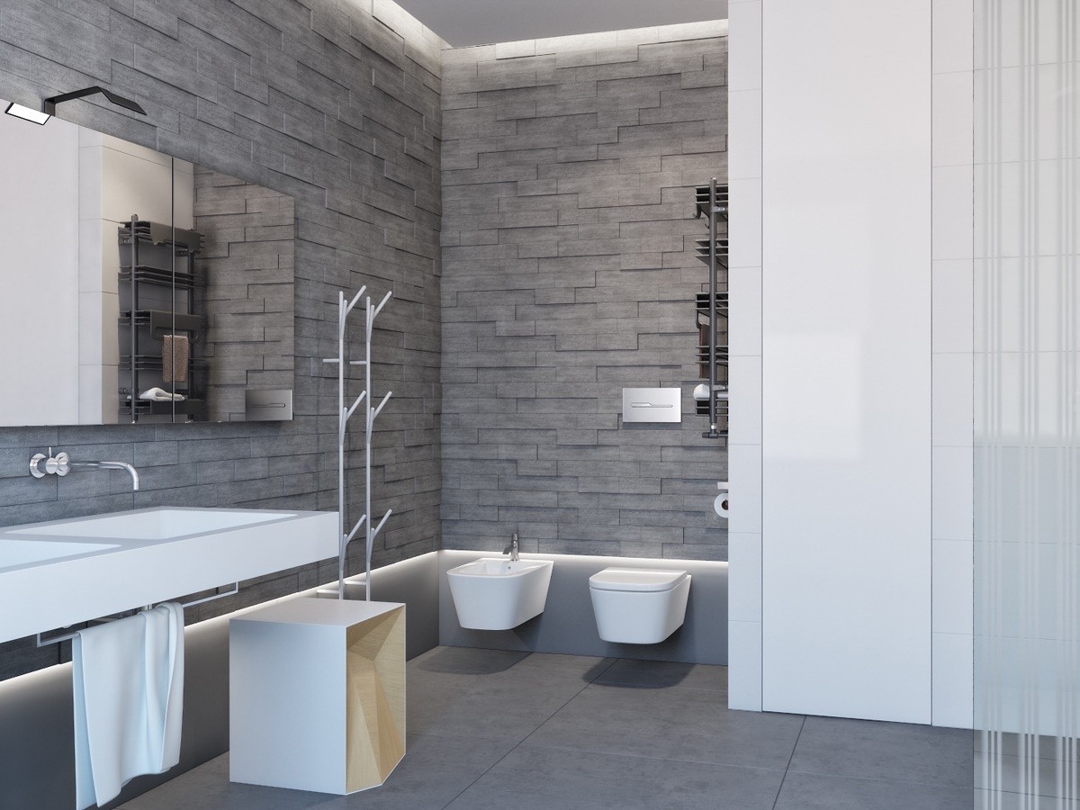Rough concrete enhances the urban aesthetic. A band of indirect lighting draws attention away from the electronics.