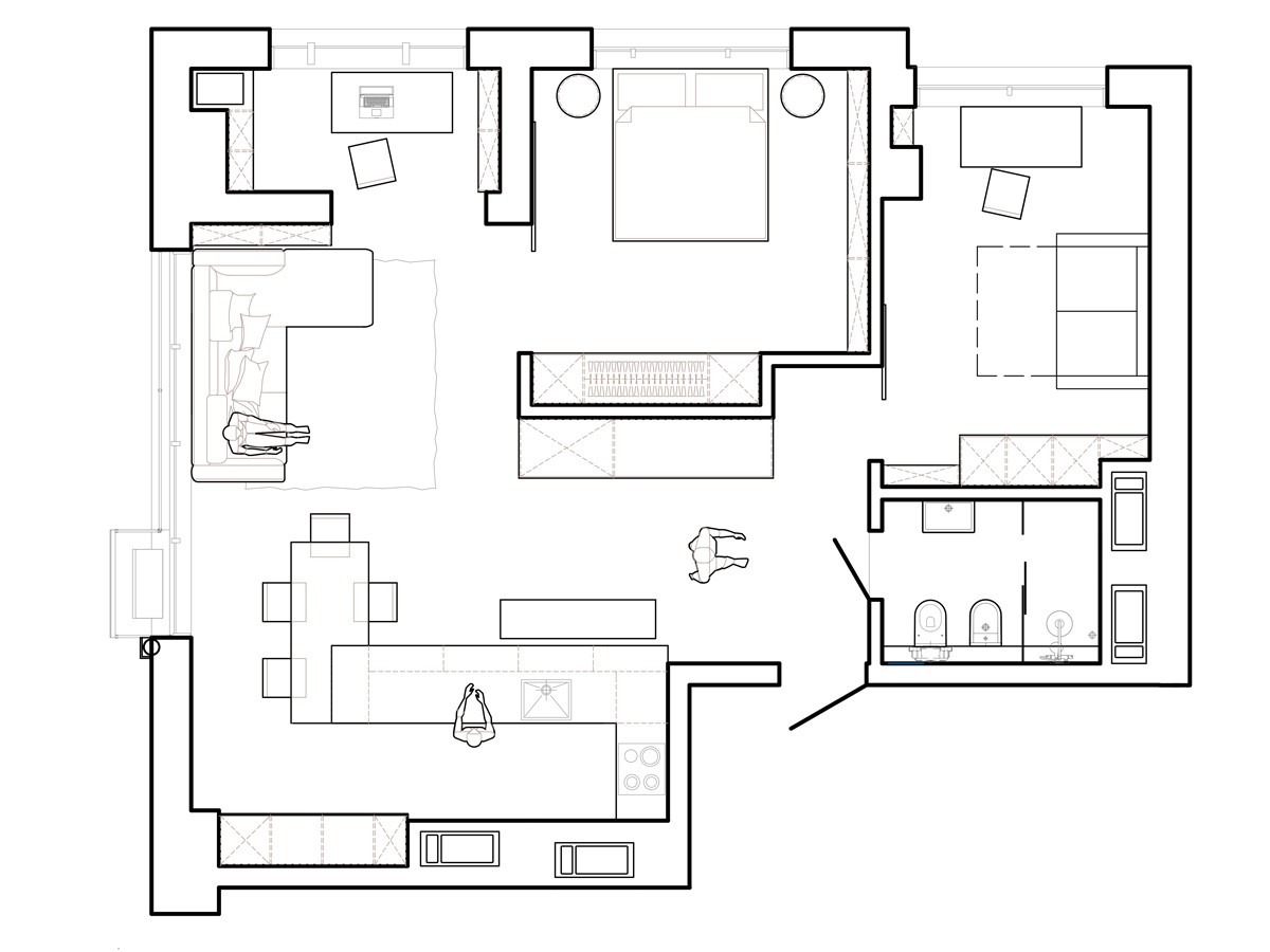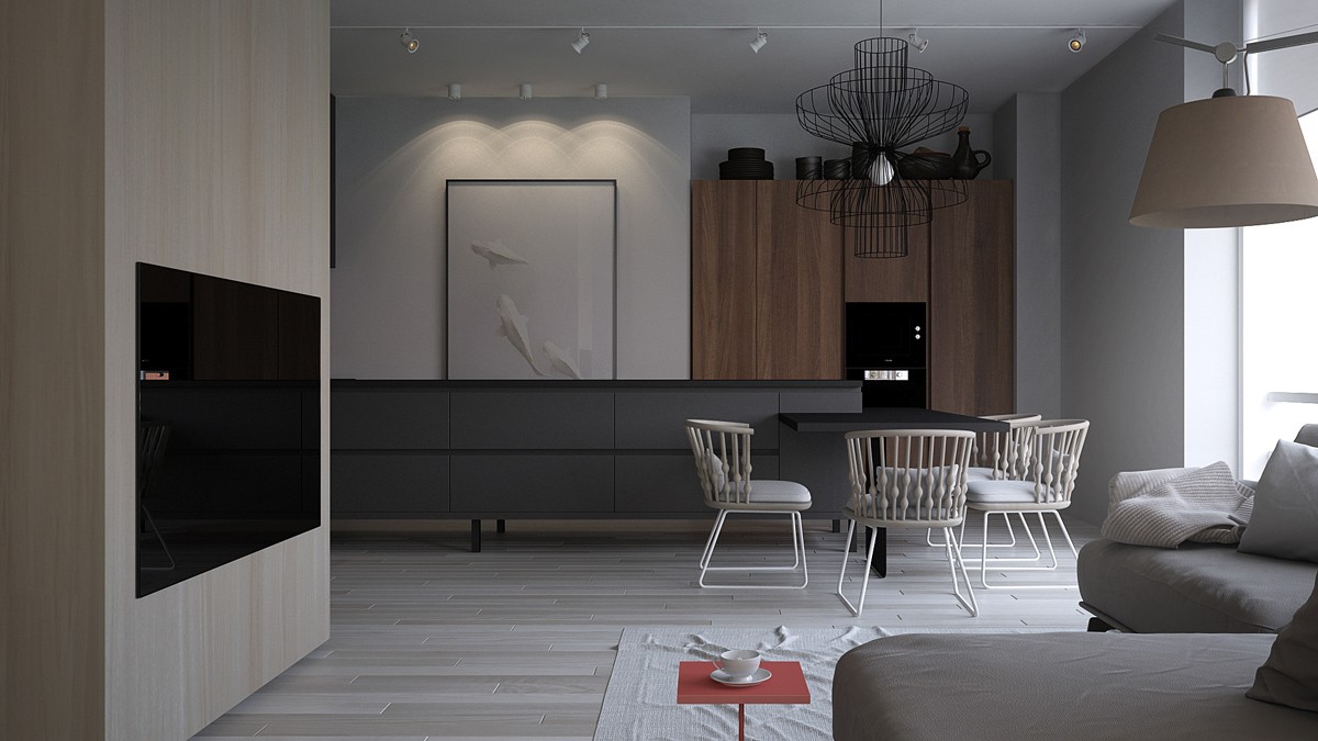 It's a compact space – not much room for a bolder color theme, really. The wooden media wall serves as a central axis with functional areas on either side.