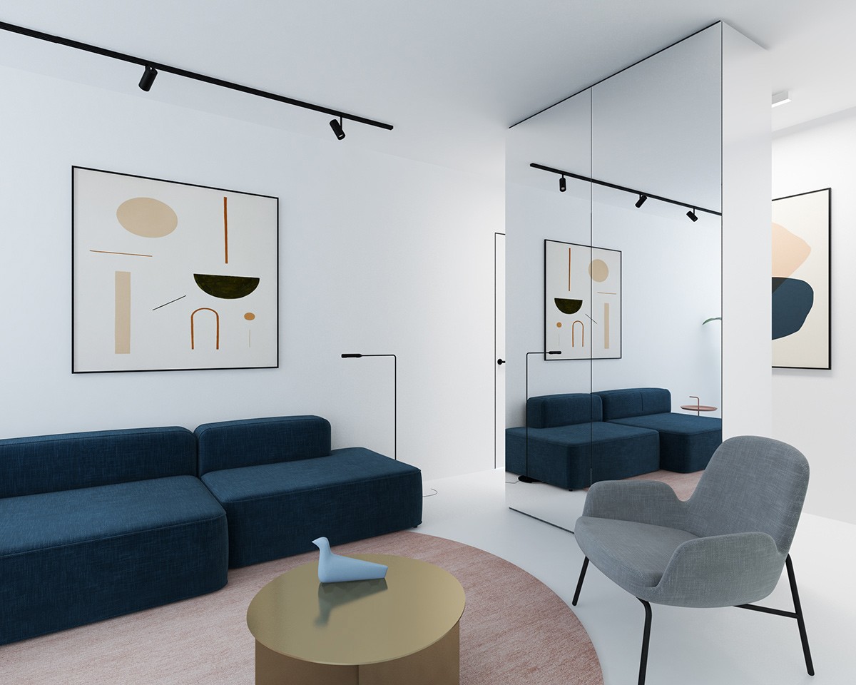 Measuring 72sqm, our first apartment in Moscow, Russia, uses block-colours on white to create a simple yet eye-catching aesthetic. The living and dining spaces evidence this white-space thinking, as a navy block couch lies its short back against the wall. Met on either side by a white-and-wooden dining table, Michael Anastassiades’ IC S Pendant Light and space-enhancing mirror, the lounge carves its own centre using concentric circles in the bronzed coffee table, pale red rug and lines in the art piece above. Grey linen offers a seat to take it in, while a glossy black TV cabinet, stark black lighting panel and unique floor lamps sketch a frame.