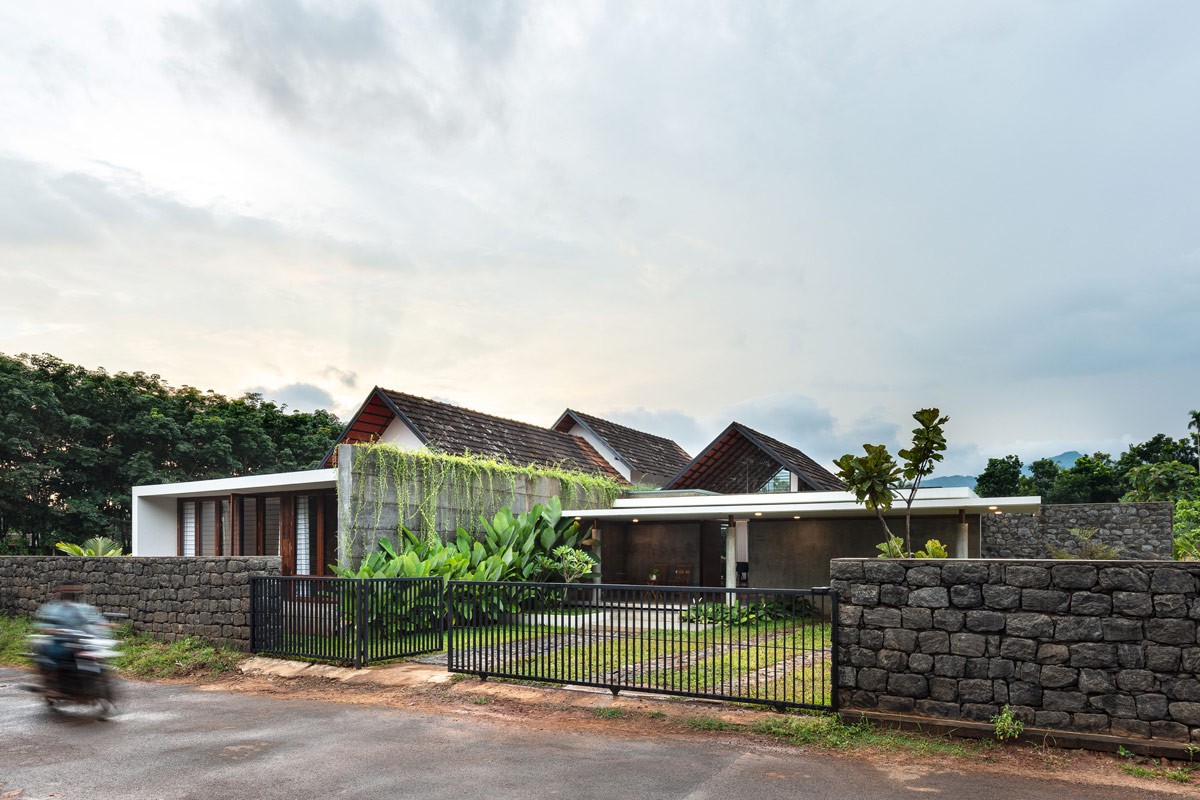 By the Chaliyar river in Malappuram, Kerala, India, the CAER project is a reimagined modern day fortress that melds with its tranquil tropical surroundings. Measuring 3950 square feet, this serene home has been designed by Encasa Archstudio to encompass natural beauty at every turn. A single story of interactive spaces fulfill the homeowners’ wish for family time, whilst private quarters are boldly shielded behind solid concrete and a jungle of Elephants Ear. The lush green indoor spaces offset the raw exposed concrete decor and rugged rubble walls. Wooden elements and a decorative clay tiled ceiling add rich tone and texture to the luxuriously large living space, where natural light floods through impressive gable windows.