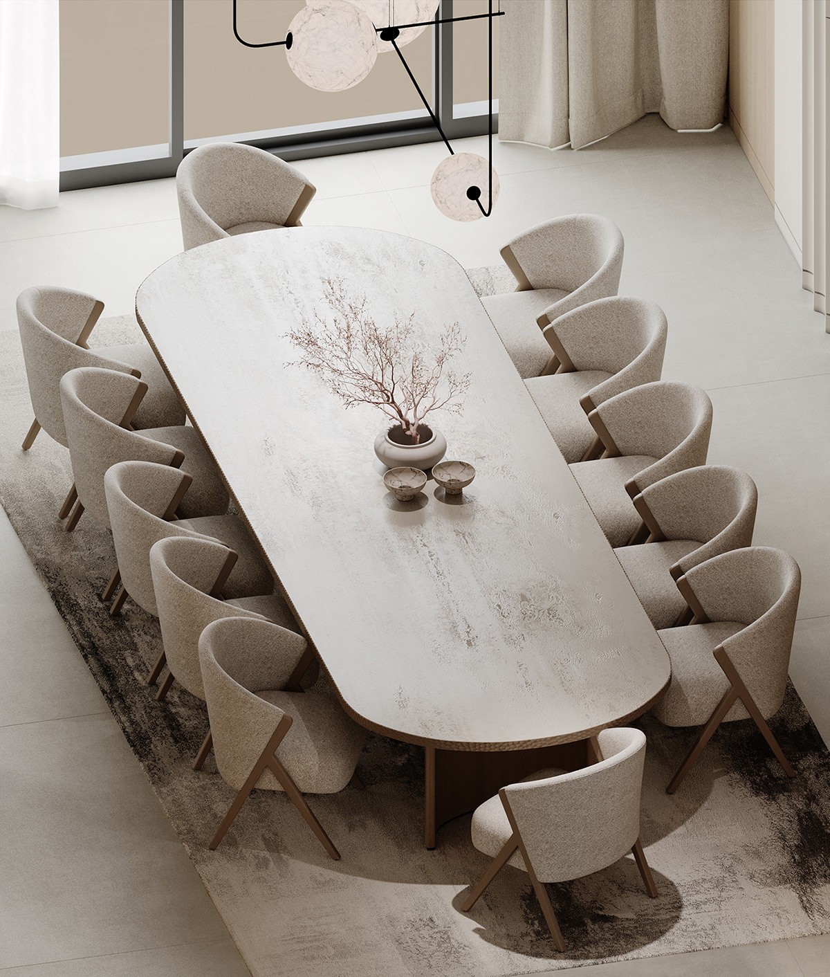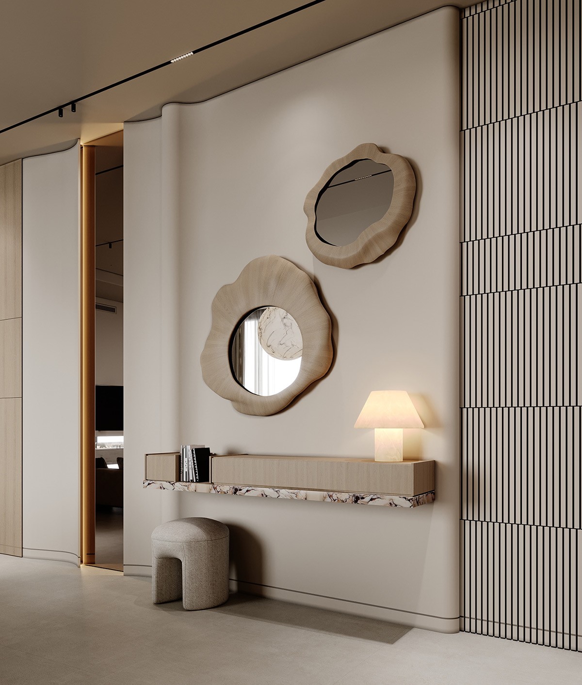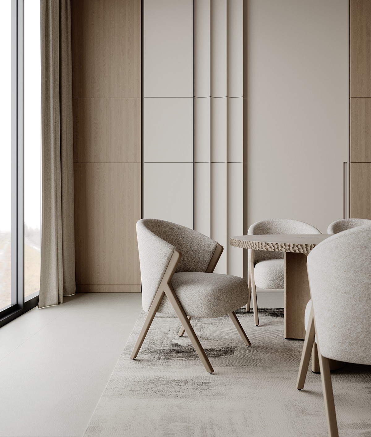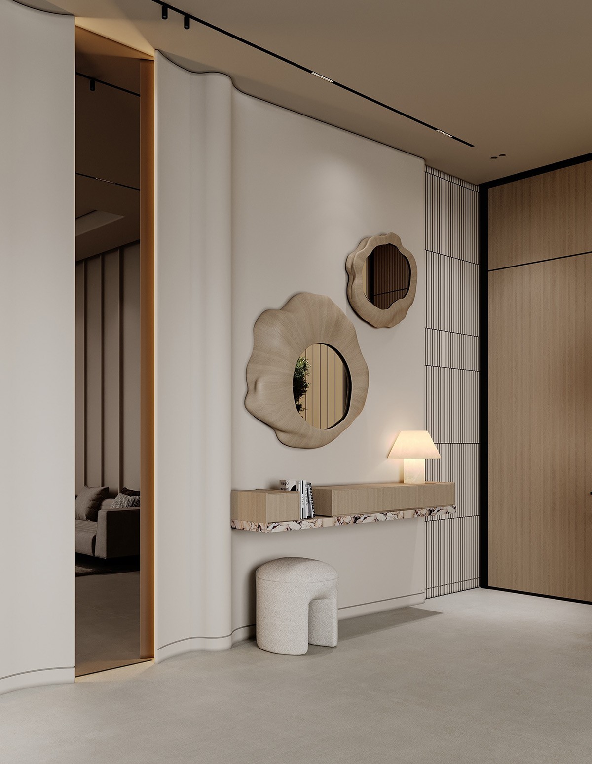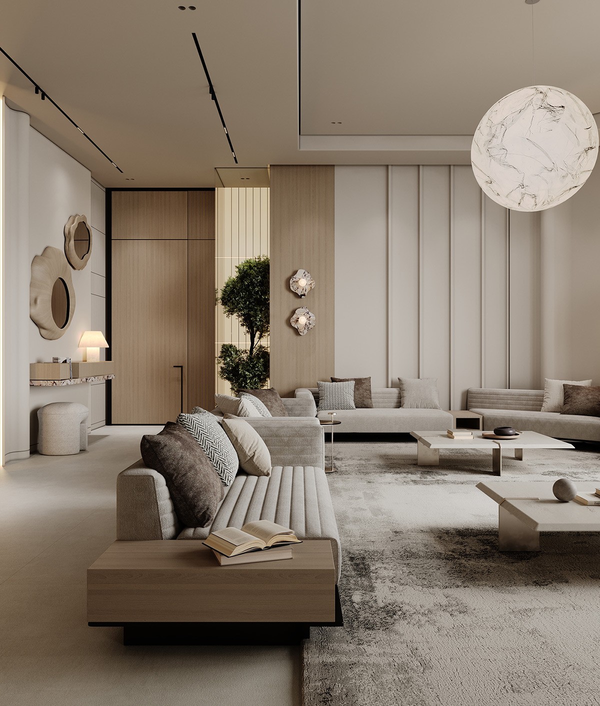 In this exquisite 120 sqm home designed by Rawan Khaled, luxury meets innovation with an open-plan layout anchored by a sleek swivel TV. The ingenious design seamlessly connects the living and dining areas, allowing effortless transitions and dynamic space utilization. The neutral palette, accented with sophisticated lighting and modern furnishings, creates a serene and elegant ambiance. Expansive windows bathe the interior in natural light, enhancing the airy feel of the open plan. Khaled’s design masterfully balances aesthetics and functionality, making this Saudi Arabian home a stunning example of contemporary luxury living. Every detail, from the chic decor to the practical layout, epitomizes refined modernity.