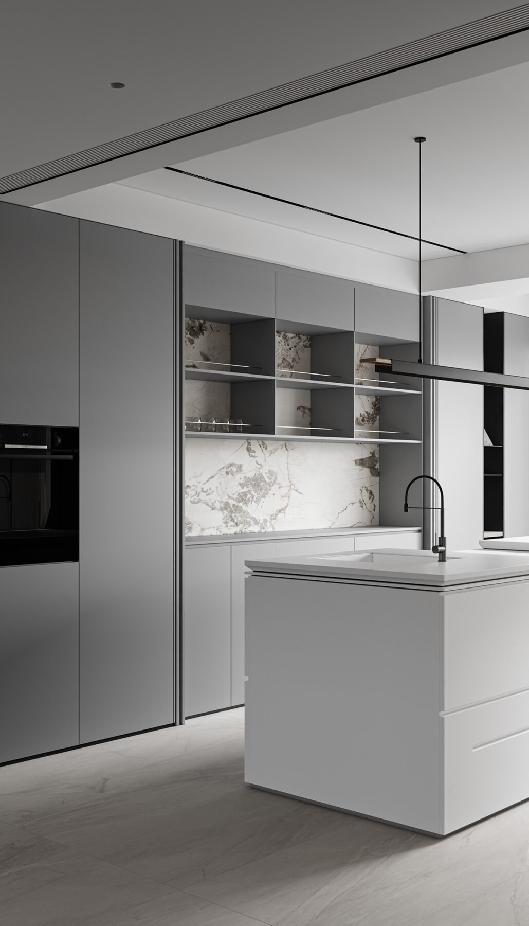 Visualized by 梦太初, these three airy home interiors are designed with modern elegance in mind. Open plan living spaces create a free-flowing way of life, where family members and friends can gather without boundaries. Daily life unfolds against a calm backdrop of pale gray, fresh white, and warm brown accents. Large windows fill these homes with natural light and glorious green views. Modern furniture designs create simple silhouettes with grace and refinement. A multitude of chic marble elements introduce a luxurious touch without appearing overly lavish. Contemporary lighting is kept understated so that layouts aren’t dominated by any singular piece. Modern fireplaces add warmth and a welcoming ambiance.