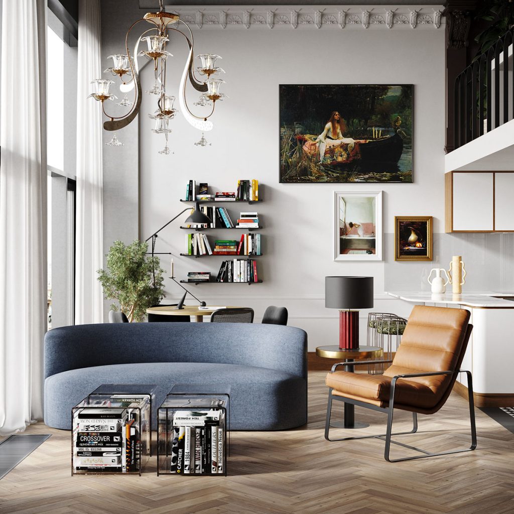 A modern curved sofa and a classically inspired chandelier mark out a lounge area within the open plan eclectic living room. Perspex coffee tables store a busy collection of books at the centre.