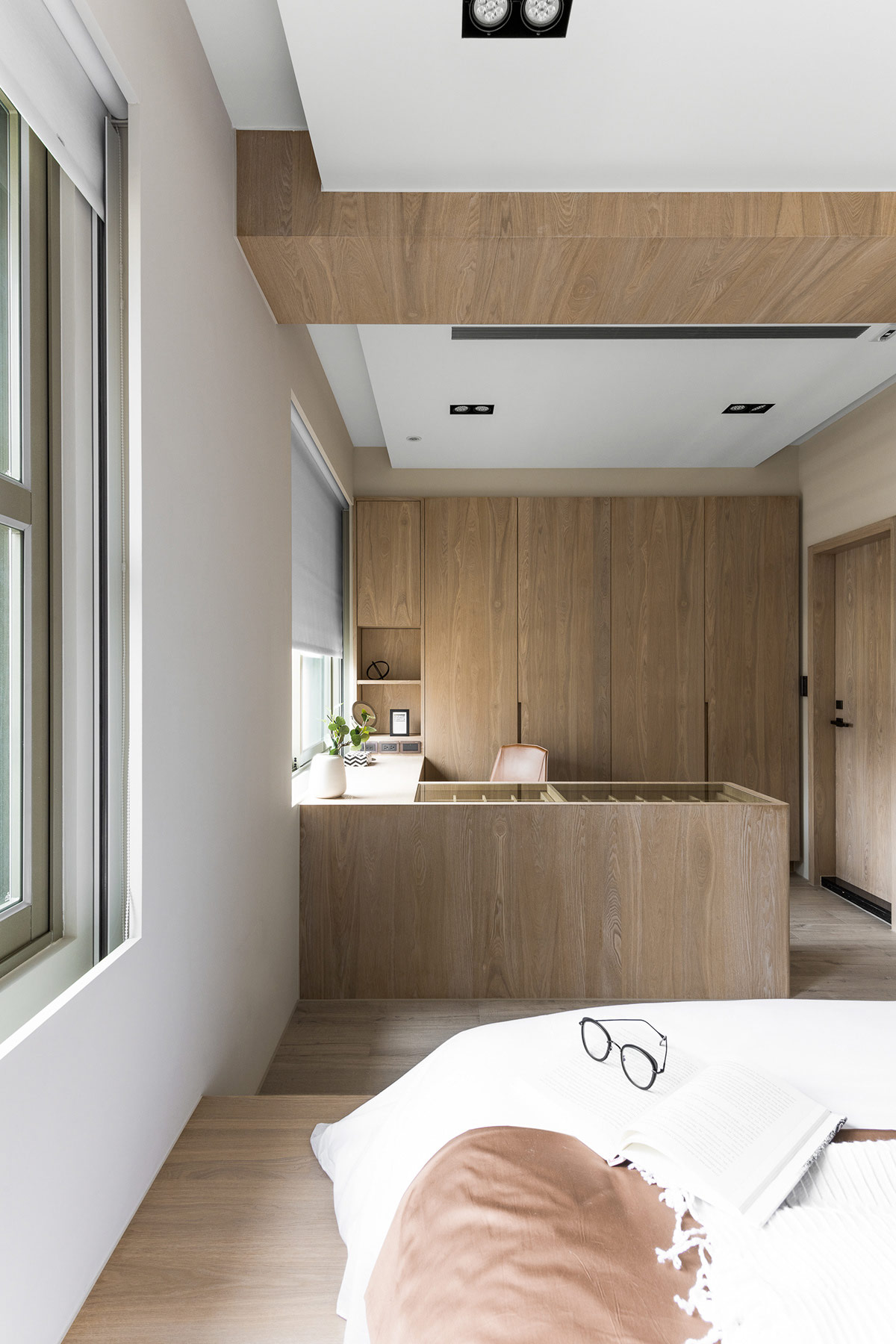 The master bedroom is devised of two different areas, one for sleeping and another for dressing. A custom built L-shaped dressing table/desk becomes the visual divider.