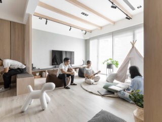 A minimalist low key layout sprinkled with bespoke features and smooth wood panelling shapes home number one. Natural wood beams stripe a crisp white ceiling, where black tracks suspend multi-directional spotlights. Seating is close to the floor, which promotes loose laid-back vibes.