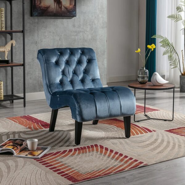 This armless slipper chair makes an elegant impact without taking up too much visual real estate. This piece features a curvaceous shape that captures the eye, its surface deeply tufted for a classic look. The silvery blue upholstery embodies pure elegance.