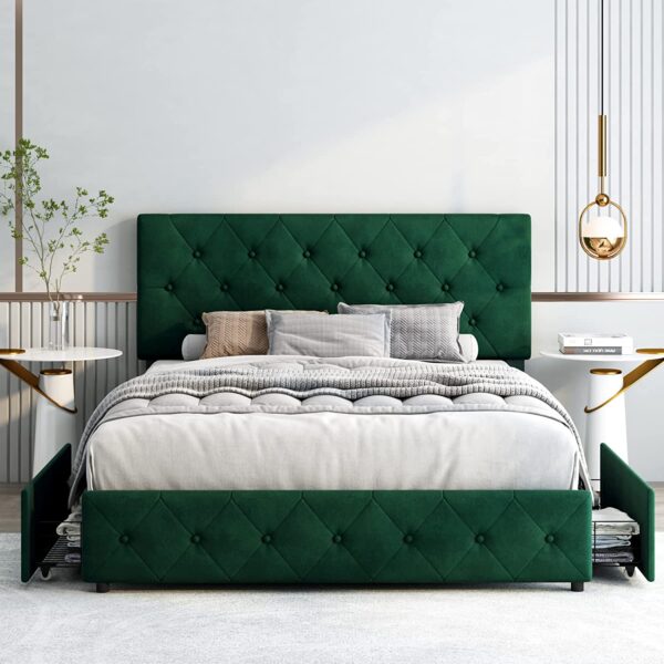 Emerald velvet upholstery is definitely having a moment, offering an effortless way to infuse any interior environment with a sense of up-to-date luxury. This bed features diamond button tufting on both the headboard and the footboard, the sides concealing four storage drawers for tidy organization. This bed is also available in a range of neutral colorways as well.