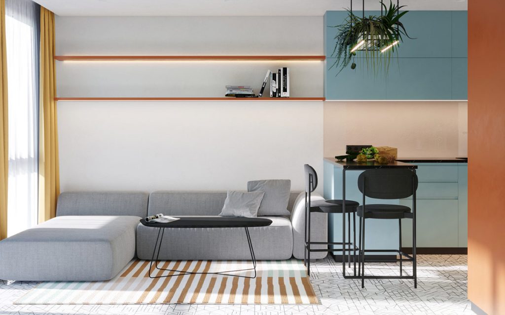 Orange shelving echoes the orange stripes of a cheerful area rug inside of our first home interior. LED light strips highlight their bold linearity and a minimalist display of books. A pale grey modular sofa cools the lounge palette, whilst a modern coffee table contributes a weighty black anchor.