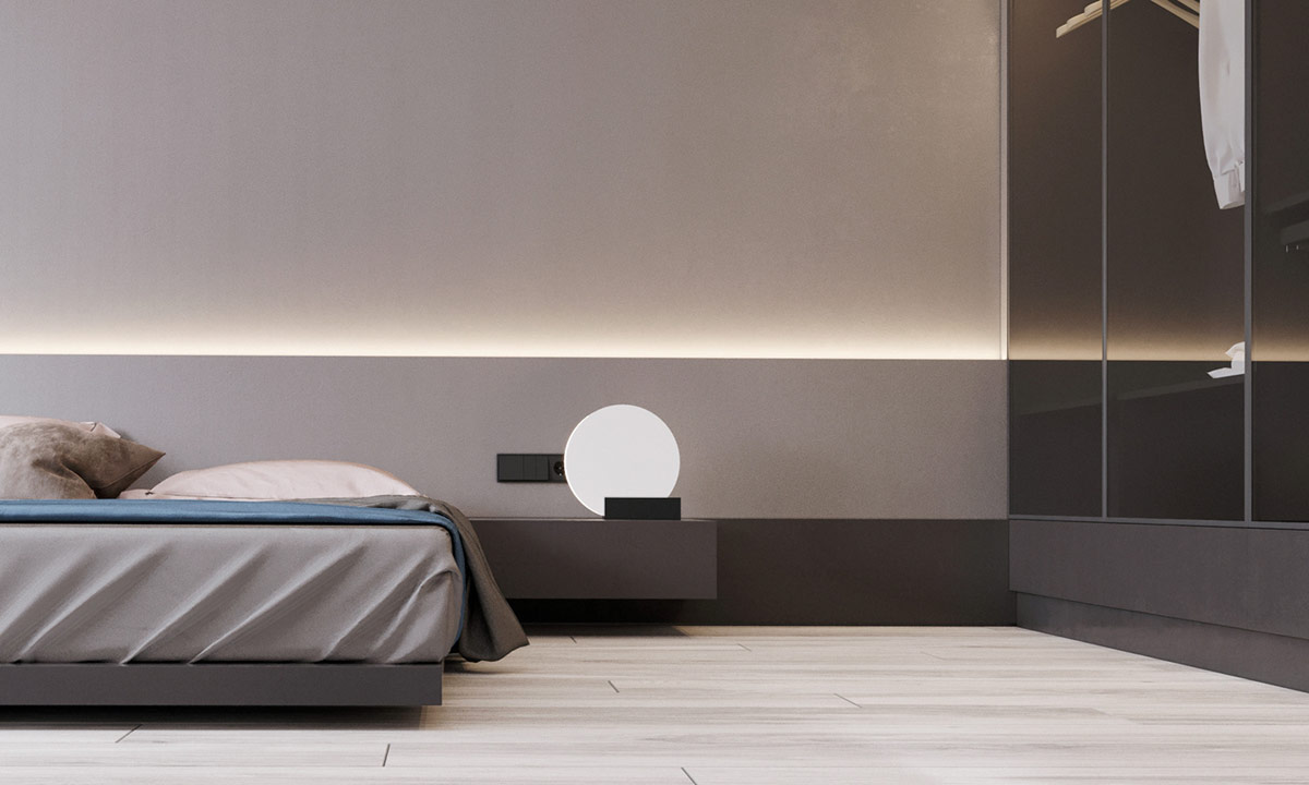 A black soffit draws zoning above the entryway to the bedroom, its adjoined glass wardrobe and the adjacent home entryway. Recessed spotlights pierce the ceiling above the bedroom walkway, whilst an LED ribbon draws a bright baseline.