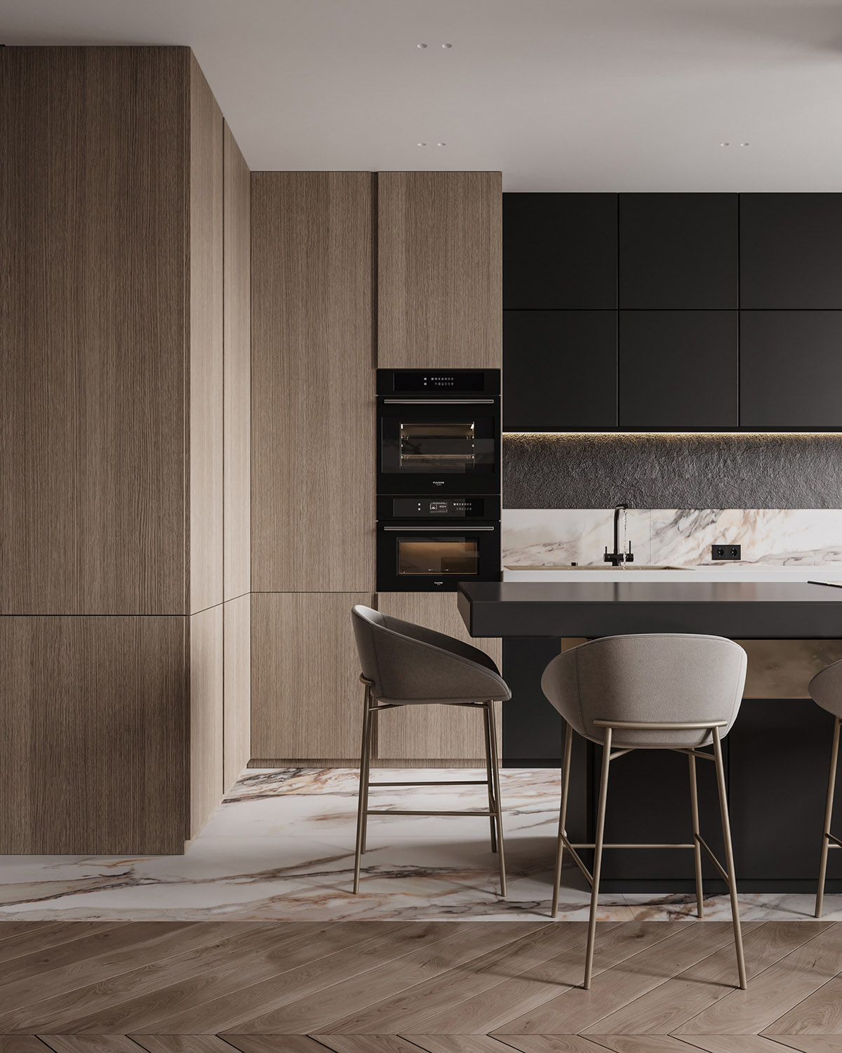 Soft greige decor elements are weighted by heavy black visual anchors in this intense modern home design, where gold accents uplift with a champagne lustre. Visualised by Clean Lines, this bold home interior is designed with small-scale luxury in mind, which is communicated through high-end finishes and bespoke storage furniture installations. White marble cladding enriches a living room focal wall, a sleek kitchen backsplash and floor treatment, and two chic bathroom designs. Wood grain weaves an inviting warmth through the intensely contrasting decor scheme, instilling a welcoming essence. Modern lighting is minimal, playing only a supporting role to the more dominant features of the striking scheme.
