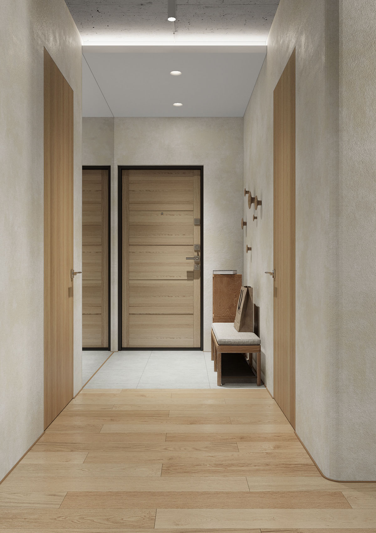 Creamy stucco walls give the apartment a simple yet warm aesthetic. Oak flooring is applied throughout to achieve a cohesive flow.