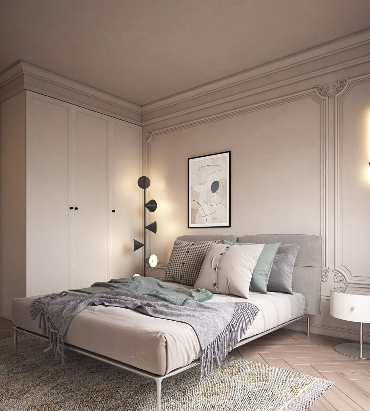 Our final neoclassical living space is a tranquil abode with layers of greige, taupe and dreamy white.