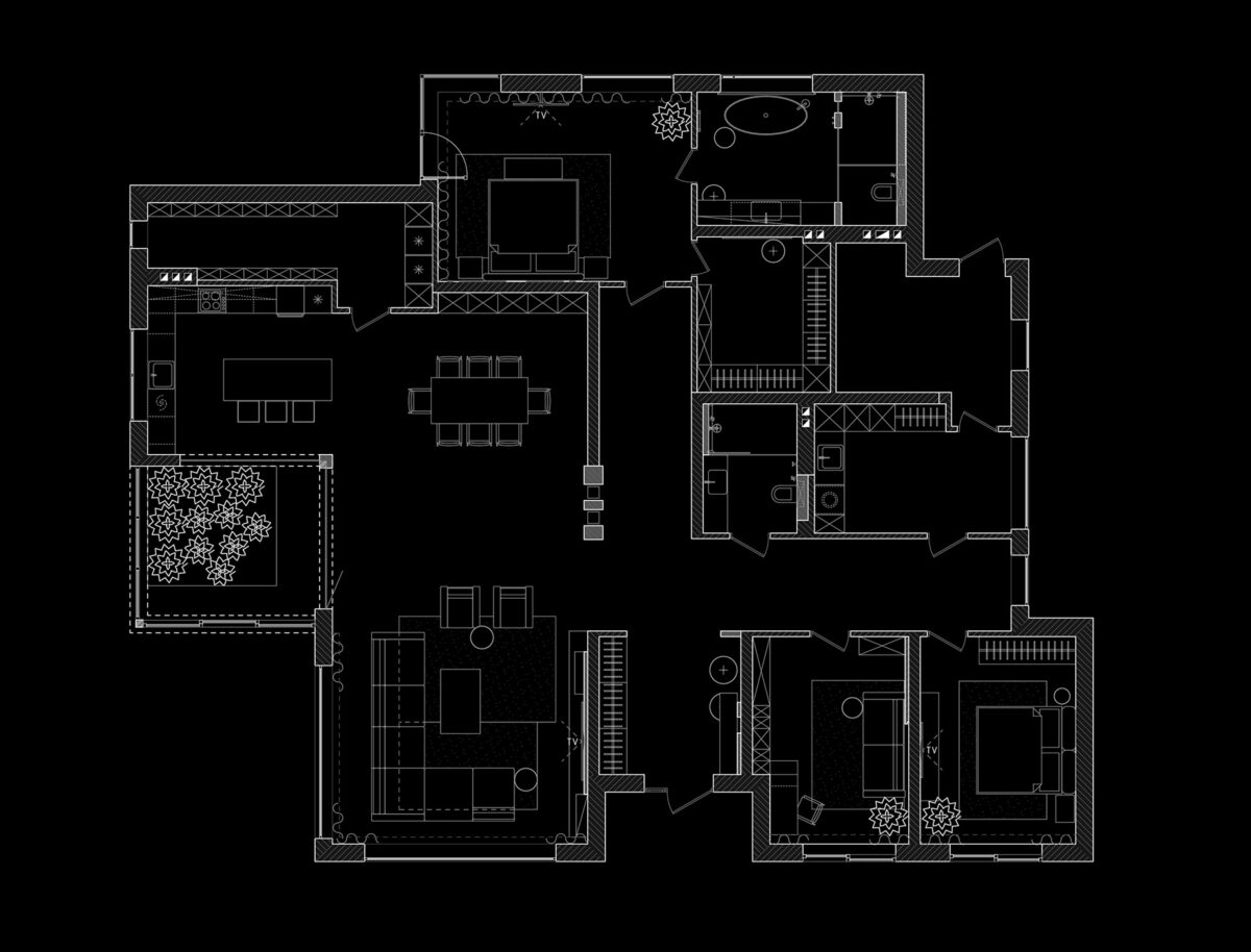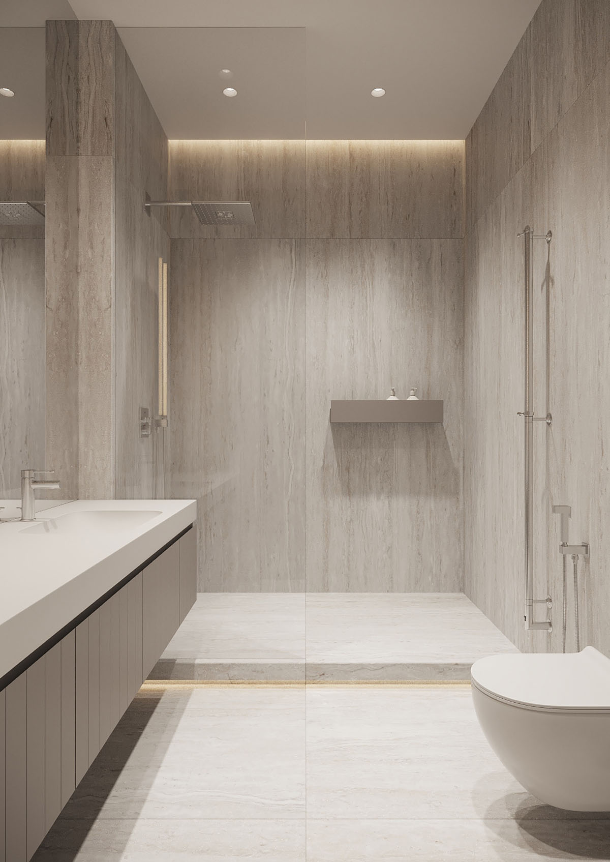 Wood and silky smooth travertine elements shape this 250 square metre luxury home interior. Designed by Studio Denew, this chic residence is light-filled and spacious, with high ceilings and high-end furniture. Furnishings follow a laconic palette of cream and greige, and area rugs are unadorned and understated. The refined decor palette allows the thread of bespoke wood and travertine details to retain the spotlight without becoming overpowered by bright colour or pattern. The result is a peaceful, reposeful living space, soothing bedrooms and relaxing bathroom designs where homeowners can be rejuvenated. Fashionable fluted textures flow throughout, along with uplifting infusions of indoor greenery, and gentle lighting schemes.