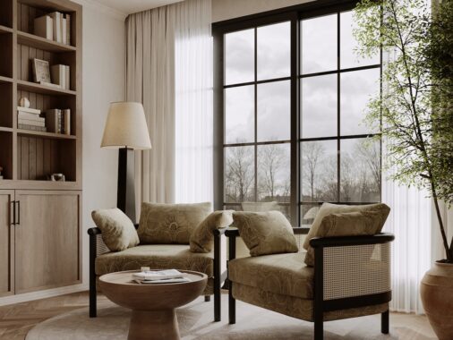 More botanical beauty is introduced via an elegant green vase on a small side table. The modern black accent table is sandwiched between two shapely wooden accent chairs to round out the seating plan.