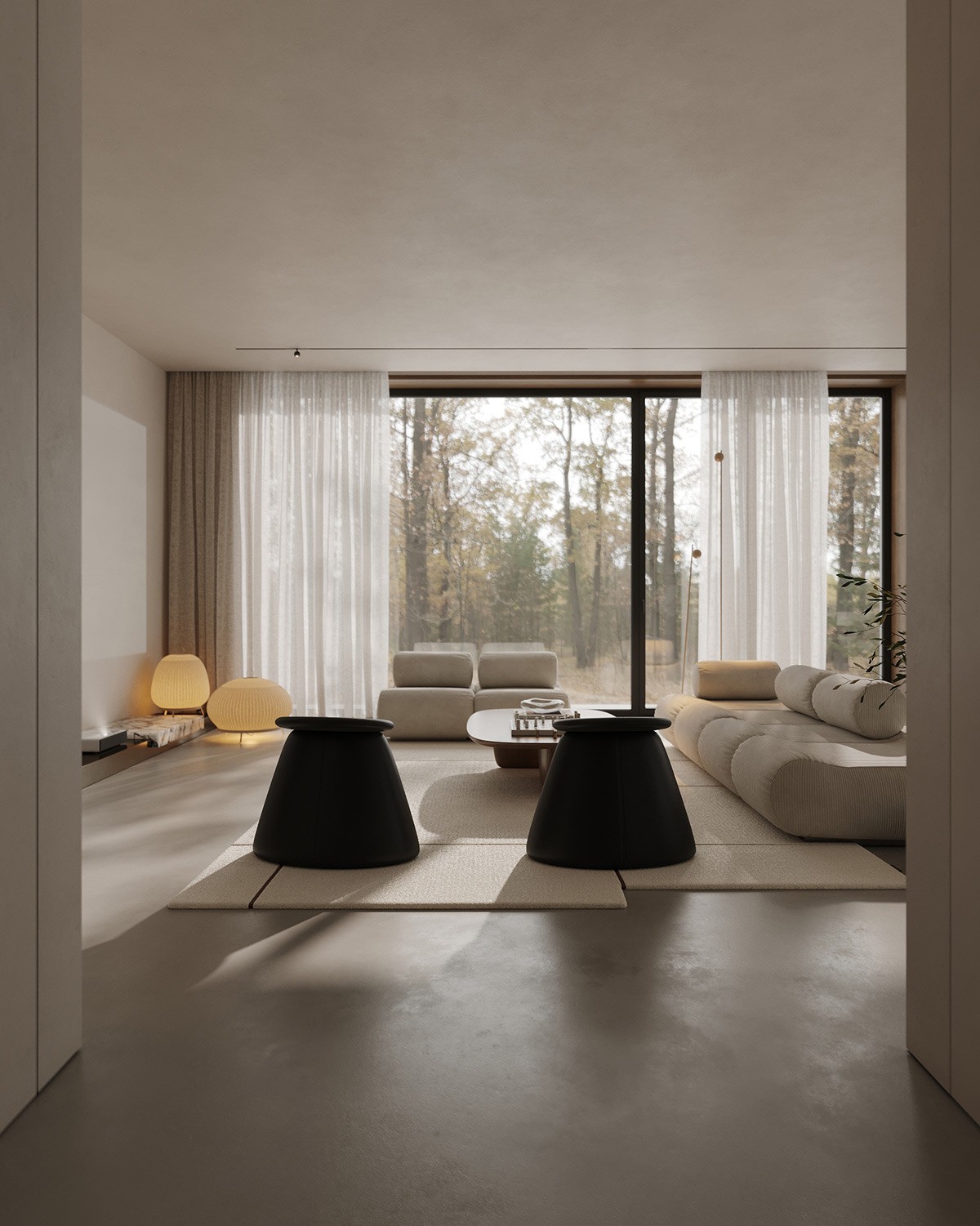 Creating a peaceful living space is an art, beautifully demonstrated by designers Diana Ioannesyan and Galina Poghosyan. Their design showcases how warm floor lamps and neutral hues can transform a room into a serene sanctuary. The soft, inviting glow of the lamps adds a cozy ambiance, perfectly complementing the room's earthy tones and plush corduroy sofas. Large windows invite natural light, enhancing the minimalist yet comforting atmosphere. This design emphasizes simplicity, where every element serves a purpose and contributes to a tranquil environment. Whether you seek relaxation or a stylish setting, this living space is a perfect blend of modern comfort and timeless elegance.