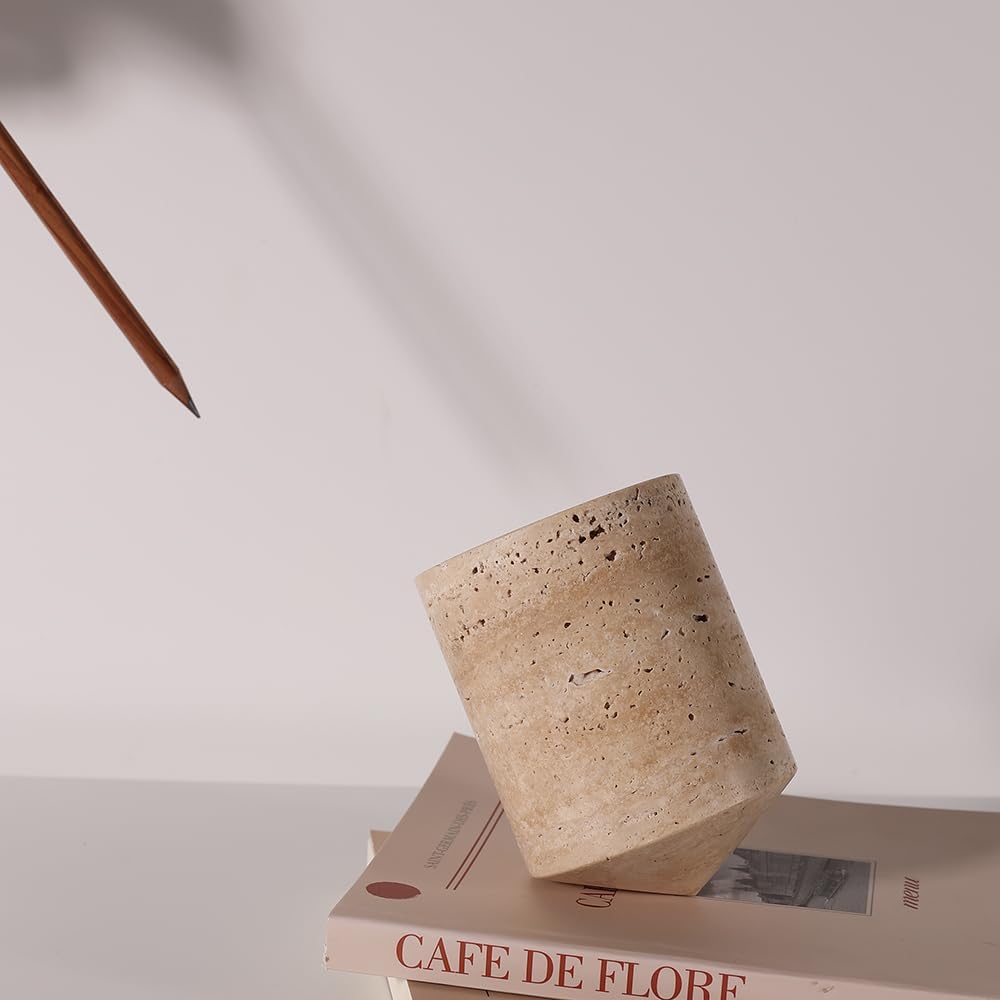 This travertine pen holder, with its cylindrical form and organic perforations, offers a unique, rotating design that pairs functional artistry with the natural elegance of stone.