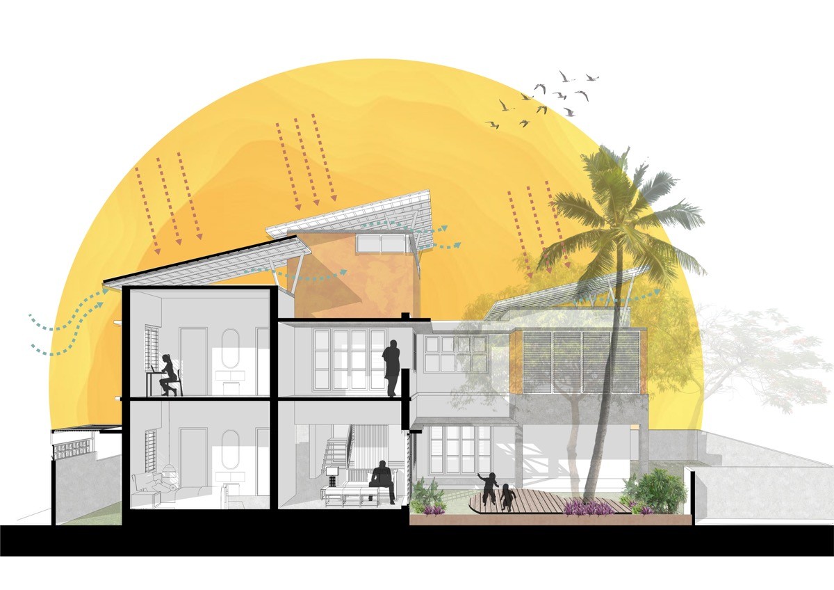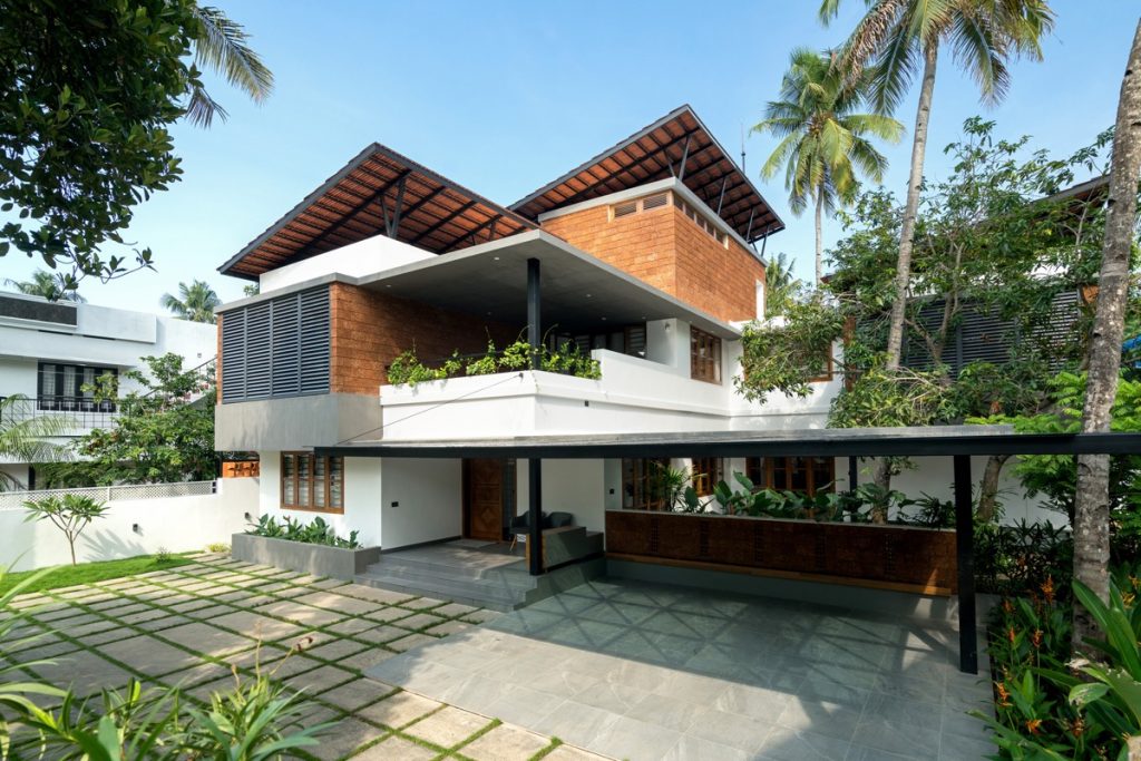 Replacing one existing house and a warehouse, this large family home was made to complement the tropical lifestyle of Kerala, India. Created by The Design Room, the architecture sympathetically retains the native trees of the 600 square metre site, and encloses several of them within a central courtyard design. The built spaces branch out from this open-air heart of the home, which achieves a cosy connection. The open plan layout was guided by the humid climatic conditions of the region. The benefits of cross ventilation, passive cooling, and natural lighting satisfied the vision for an energy-efficient home. Outside, the vegetation contrasts vibrantly with the visual heat of iron-rich red laterite stone.