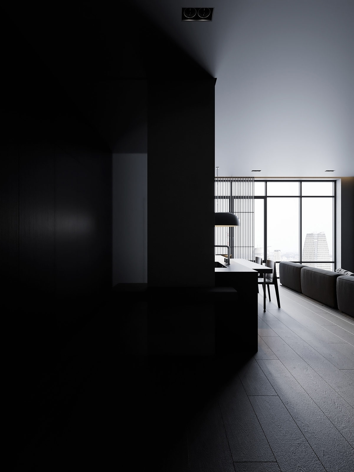 Our second dark home interior features sections of mid grey against contrasting volumes of deepest black.