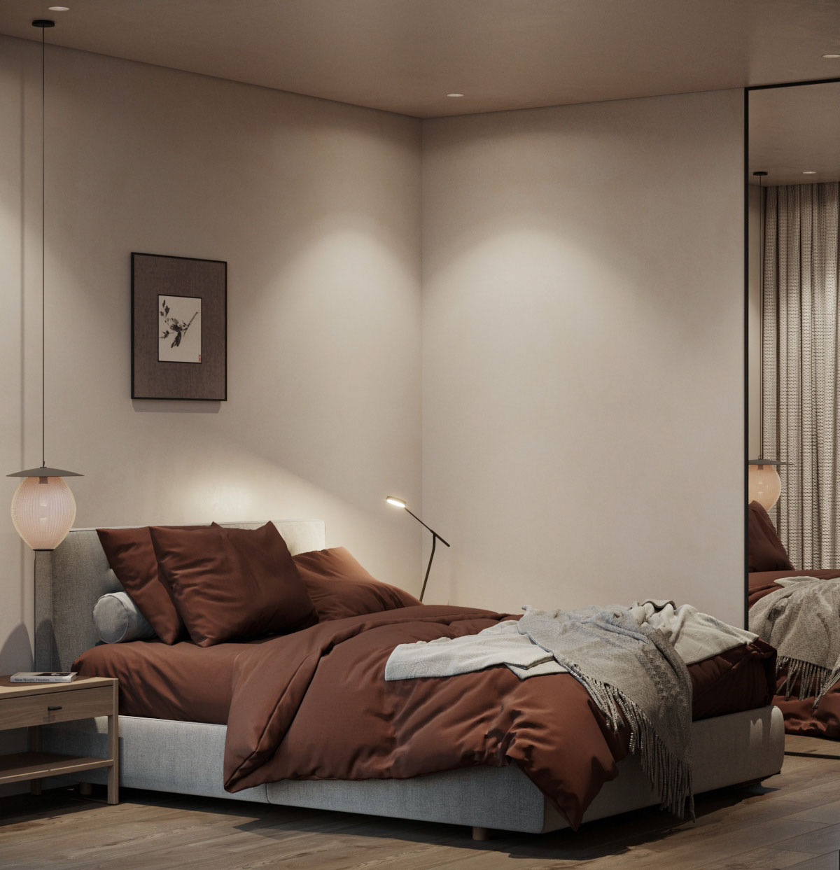 In these two small home designs, muted red and green accents are used to break up compact spaces and to help create zoning. High-contrast red accessories create a visual heat, which is complemented by areas of natural wood tone. Soft green hues and indoor plants make a fresh and uplifting contribution. In home number one, red accents define a small dining area and a neighboring kitchen. In the bedroom, a red duvet set separates the sleep space from a green home workspace. In home design number two, we’ll see how muted red moments call attention to a living room media wall, a small dining table, and a welcoming front entryway.