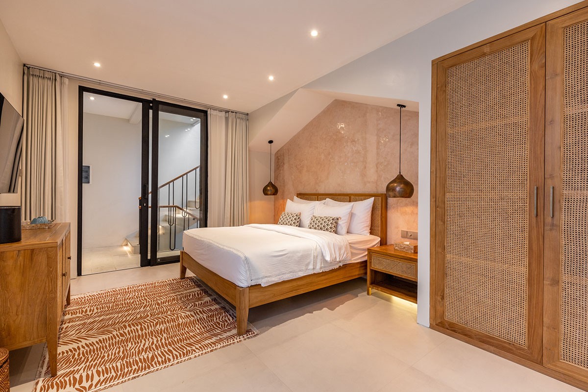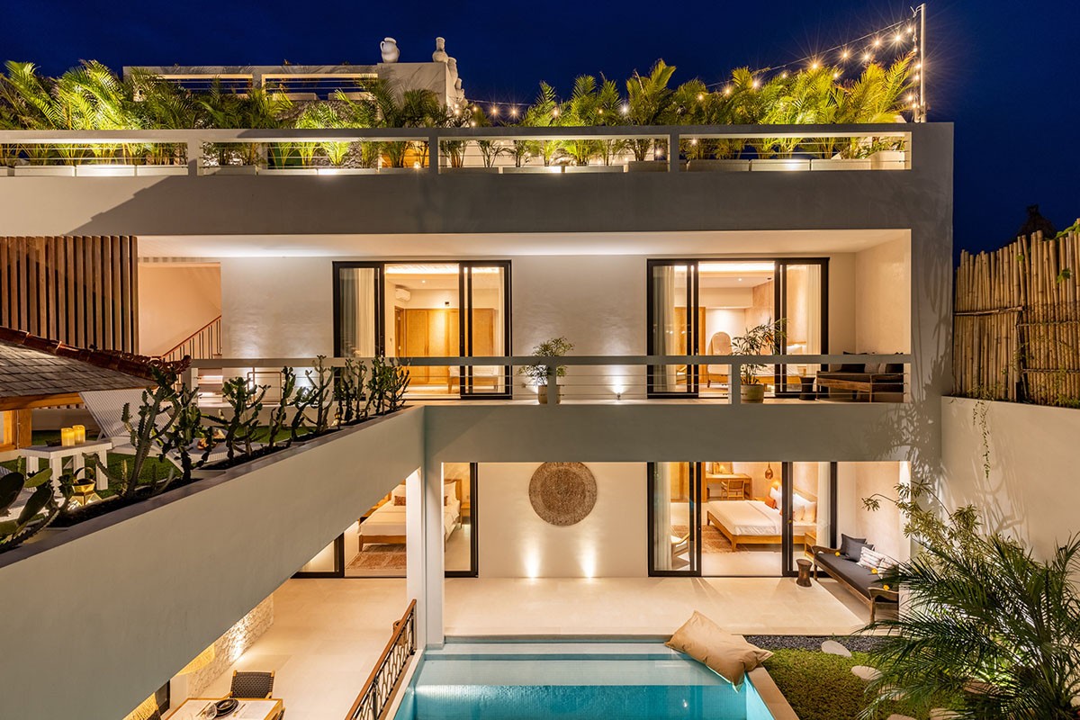 A warm and inviting energy exudes from these two tropical boho home designs, photographed by Danang Seta. They are peppered with natural elements and thoughtful vignettes that keep the eye engaged and the aesthetic consistent. Each home boasts a fresh poolside vista, where palm trees loll amongst lush green borders. Design number one comes to life with a cozy lighting scheme of recessed LED ribbons, which trim shallow recesses and highlight key features in every room. Home number two is shaped by a plethora of beautiful archways that adjoin rooms, frame the wonderful terrace vista, and build captivating statements. Smoothly sculpted shelving nooks extrude from the wall stucco to integrate more eye-catching vignettes.