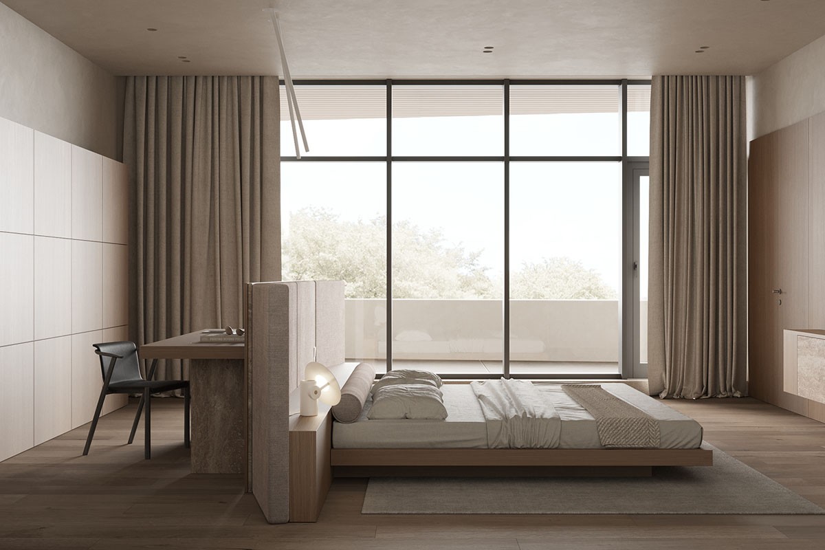Beige, greige, wood, and travertine decor elements culminate in a warm and welcoming interior design with a stylish aesthetic. Visualised by ZEWorkroom Studio, this modern home is a smooth and seductive space, where neutral decor is striking in its simplicity. In the spacious living room, elegant focal walls form a textured room divider and an eye-catching TV wall. The kitchen diner is a tranquil space with a travertine island, smooth beige stucco walls, and atmospheric lighting. Upstairs, the master bedroom includes a secluded home workspace that’s artfully tucked behind a partition headboard. The kid’s room offers playful inspiration with a fun slide and a hideaway play loft.