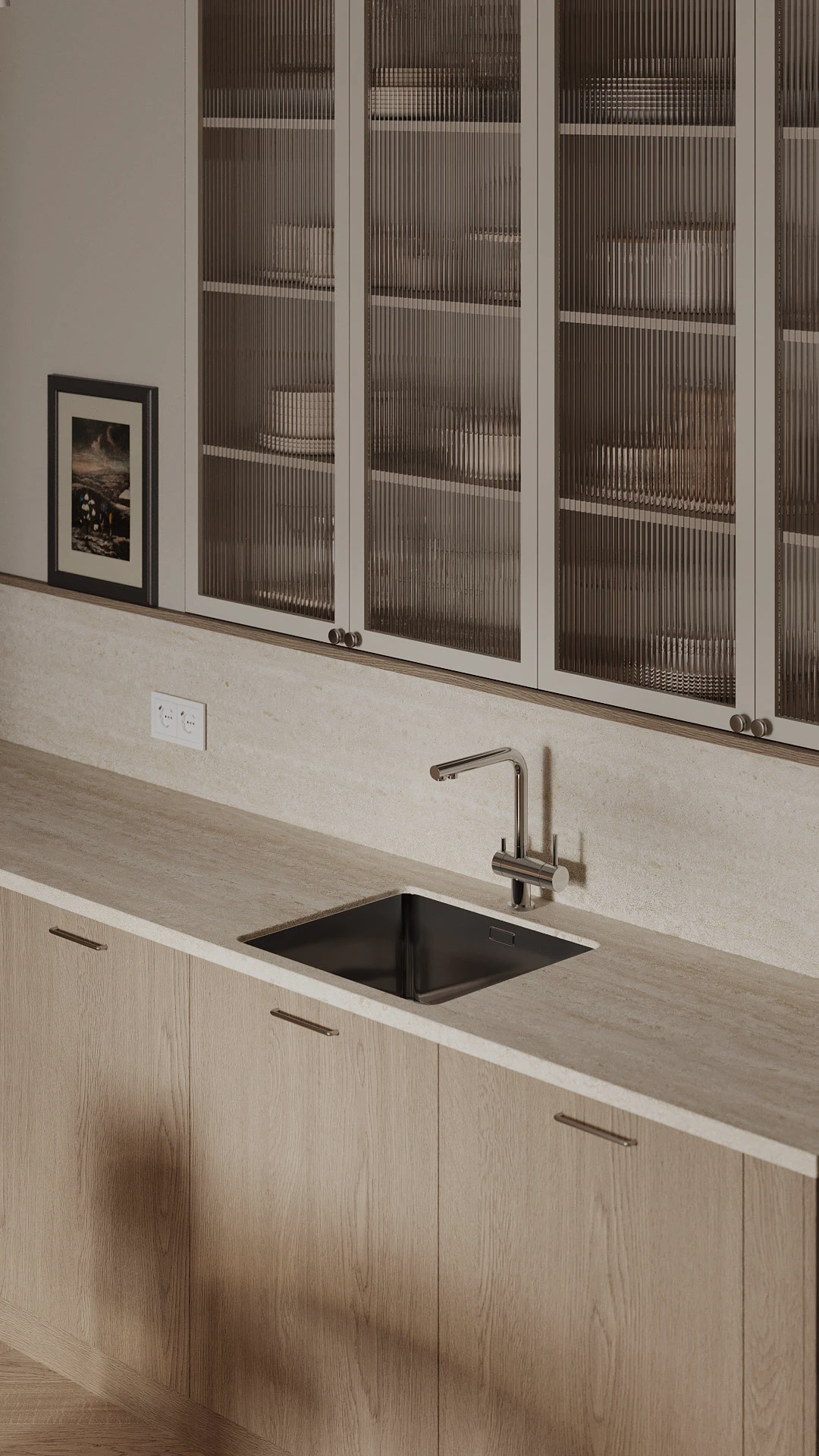 This open-plan space is the heart of the home—where calm mornings begin and cozy evenings end. The seamless transition from kitchen to dining to living is anchored in soft beige tones and natural wood finishes. The kitchen pairs sleek cabinetry with glass-front uppers, while the adjacent dining area centres around a minimalist round table perfect for slow meals and meaningful conversations. In the living zone, layered textures and earthy hues invite you to sink in and stay a while. Everything here feels connected, cohesive, and designed with everyday comfort in mind.