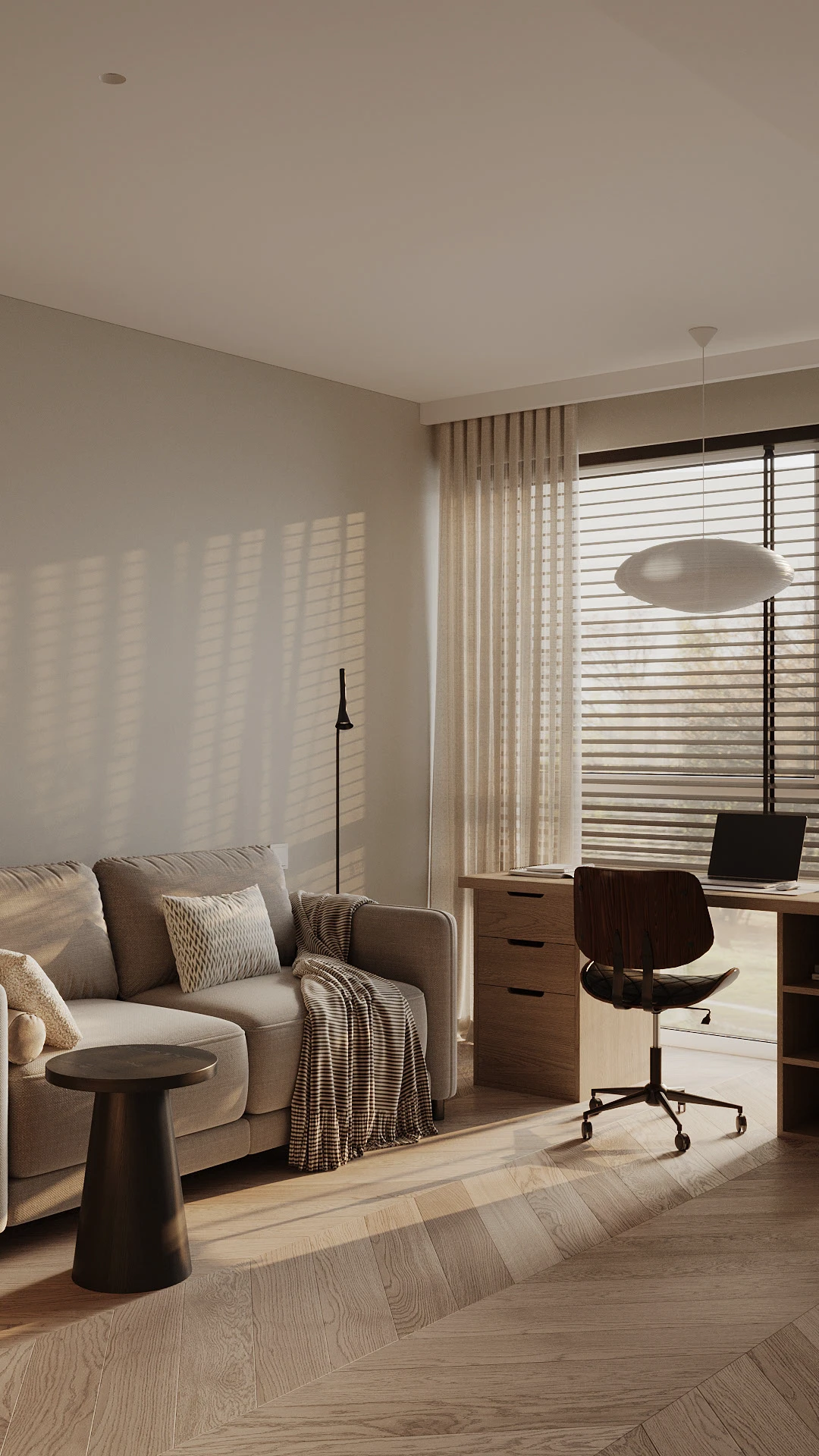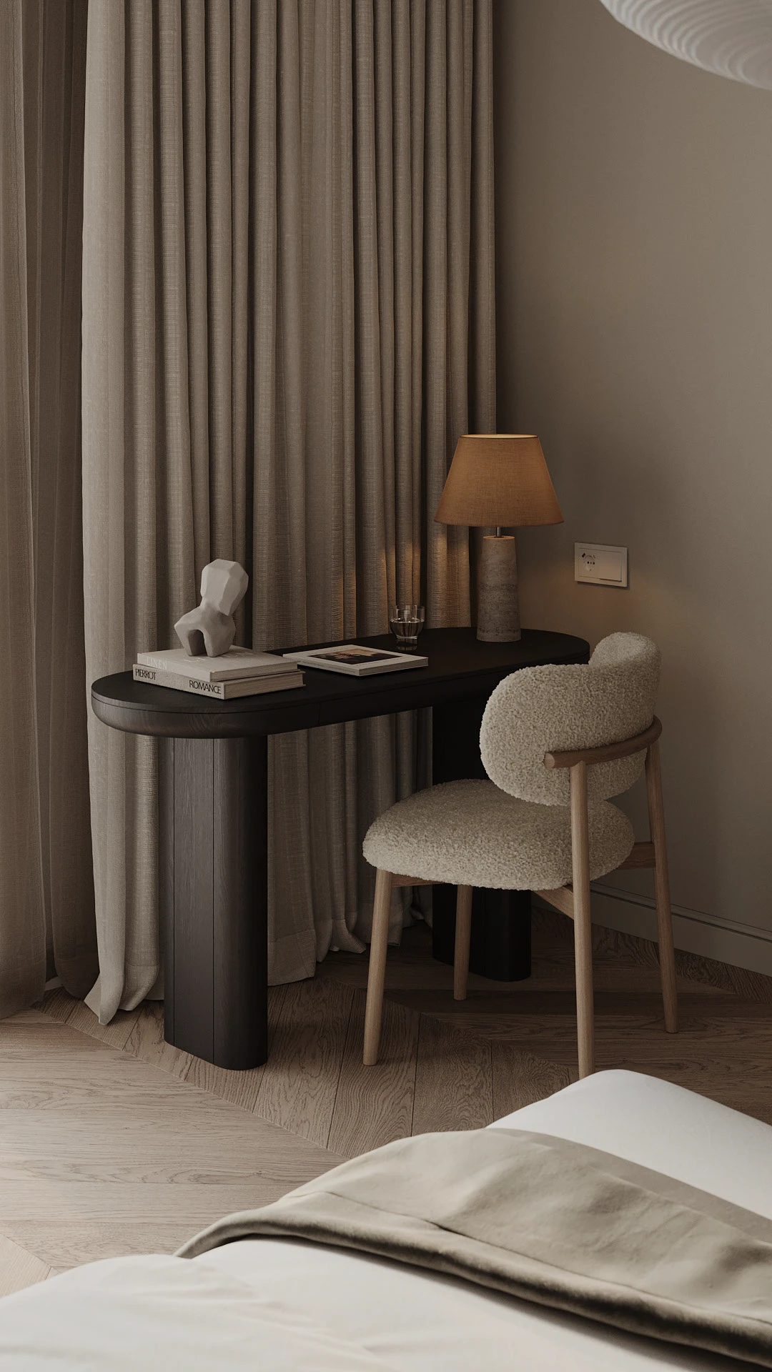 Soft morning light filters through layered sheers. This casts shadows that move with the breeze, adding understated elegance. The color palette is tones of oat, clay, and warm wood (together, these invite deep rest). A low, upholstered bed paired with fluted sconces creates a cocoon-like atmosphere, while hidden storage behind seamless panels keeps the room calm and uncluttered. In one nook is an accent chair made from rattan, while a compact workstation near the window lets you work with the best views.