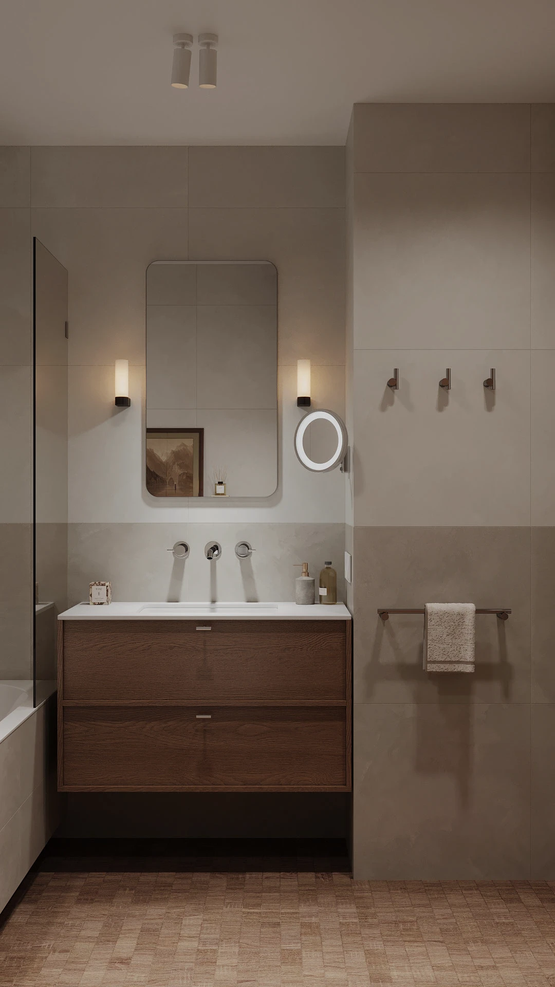 In the bathroom, soft taupe tiles wrap the space in warmth. Rich wood cabinetry and slatted storage add organic texture. A floating vanity keeps the layout feeling airy, complemented by sleek wall-mounted fixtures and gentle uplighting. Every detail is considered—from the built-in shelving for everyday essentials to the serene artwork above the toilet. It’s a space that invites slow starts, quiet endings, and everything in between.