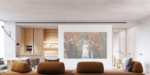 The white decor makes a projector friendly living room. Tiles differentiate a feature wall behind the caramel sofa.